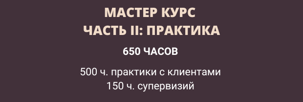 Мастер Курс донабор часов: 60 часов личной терапии личной учебной терапии. Супервизии - 150 часов, из них минимум 25 с одним индивидуальным супервизором. Сертификат: Европейский психотерапевт (WAPP)